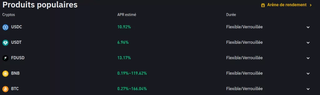 Exemple de rendements proposés par des produits Binance Earn